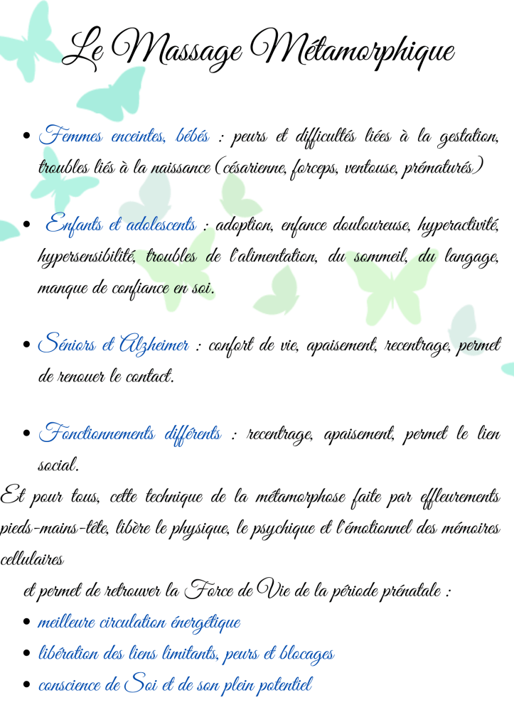 Le Massage Métamorphique est avant tout un outil de réalisation de son potentiel, libération de blocages, tensions, circulation libre de l’énergie de vie (harmonisation du circuit énergétique).